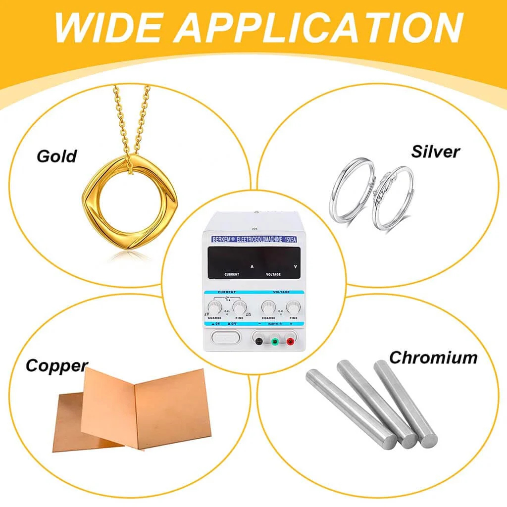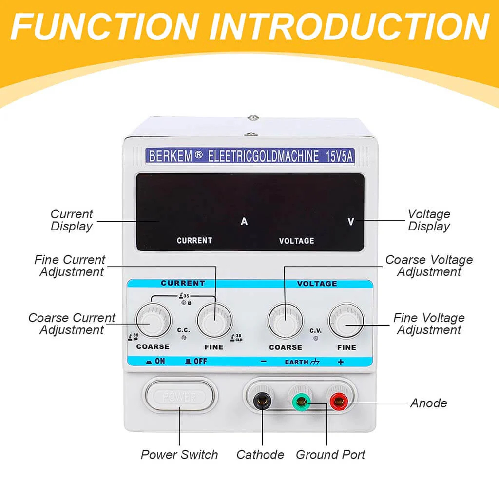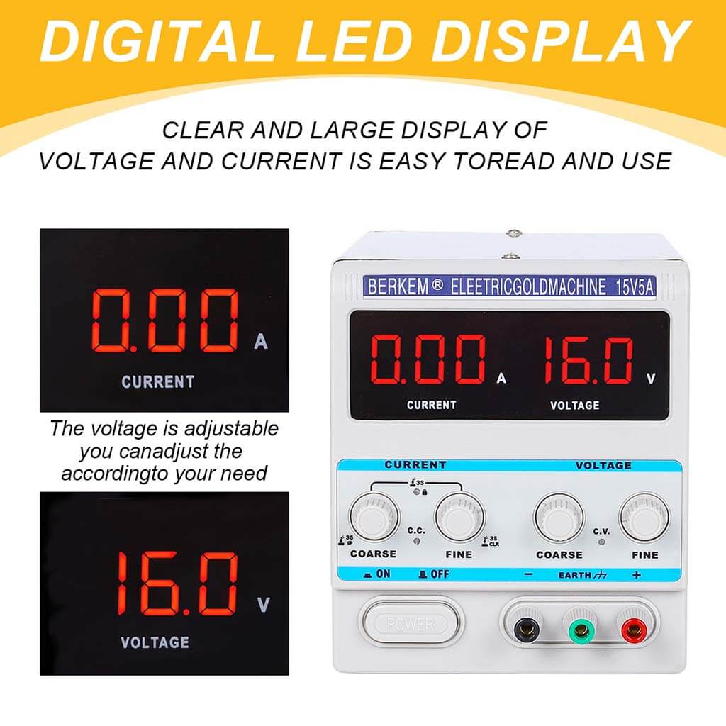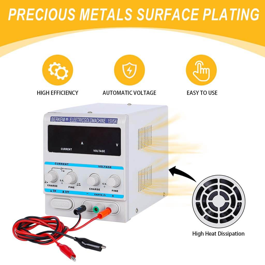 Adjustable voltage output up to 15V with current up to 5A for electroplating use.