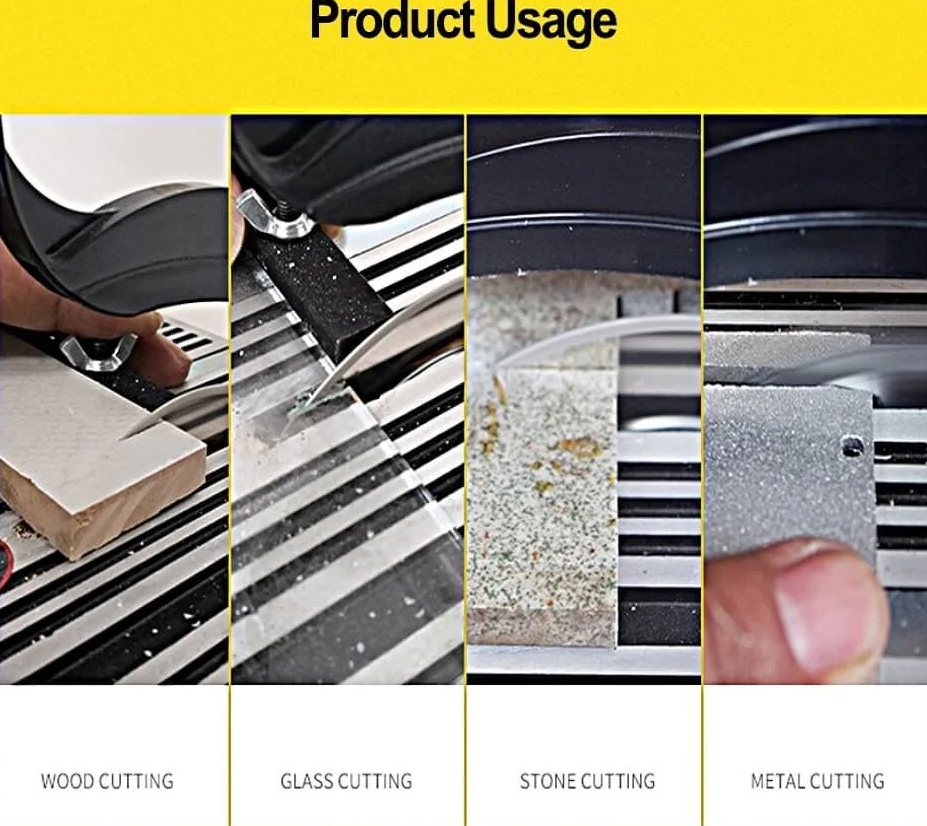 This miniature tabletop saw is designed for cutting various materials such as non-ferrous metals, stone, wood, glass, and plastic. It is commonly used for both metallic and non-metallic materials.
