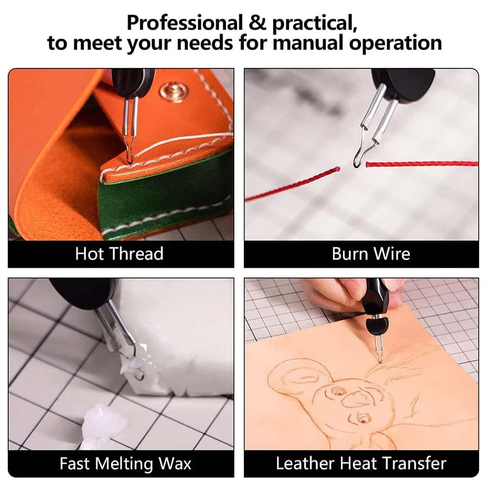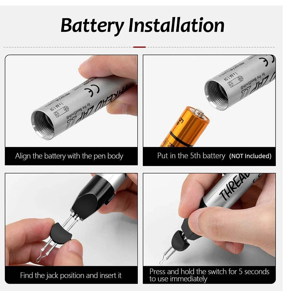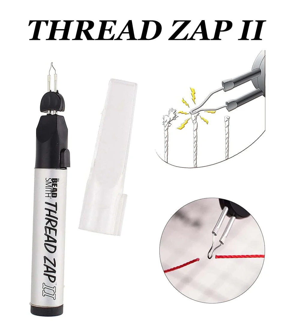 Battery-operated thread zapper for cutting and sealing thread ends. Tip heats when button is pressed.