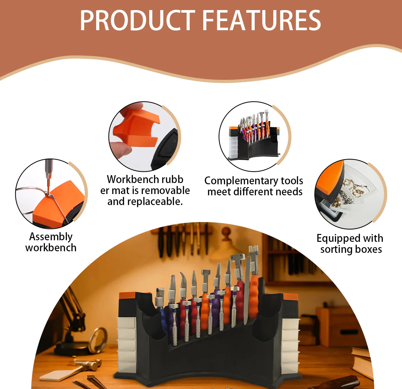 Multi-purpose tool kit for jewelry, watch, optical, and electronics work. Includes pliers, screwdrivers, tweezers, and tool rack with workbenches and storage.