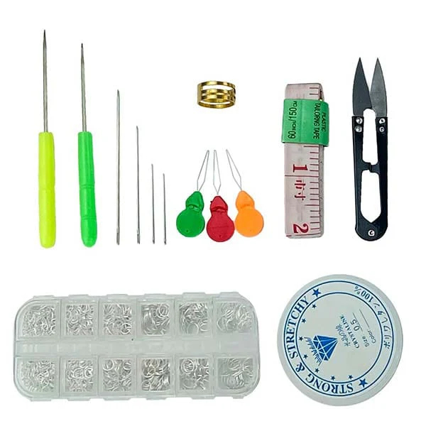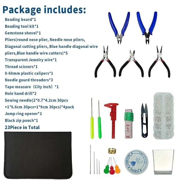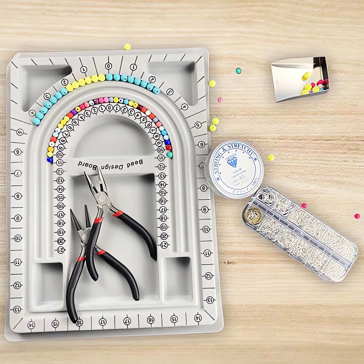 Beading tool kit with beaded design board and 5 pliers. Flocked grey surface. Clear plastic lid. Portable storage case. Includes silver metal charms.