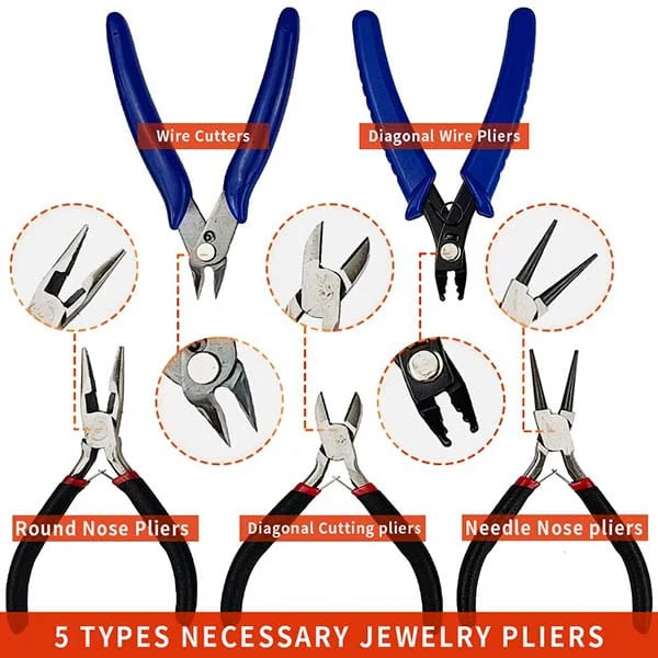 Pliers: round nose, needle nose, diagonal cutting, blue handle diagonal wire pliers, blue handle wire cutters.