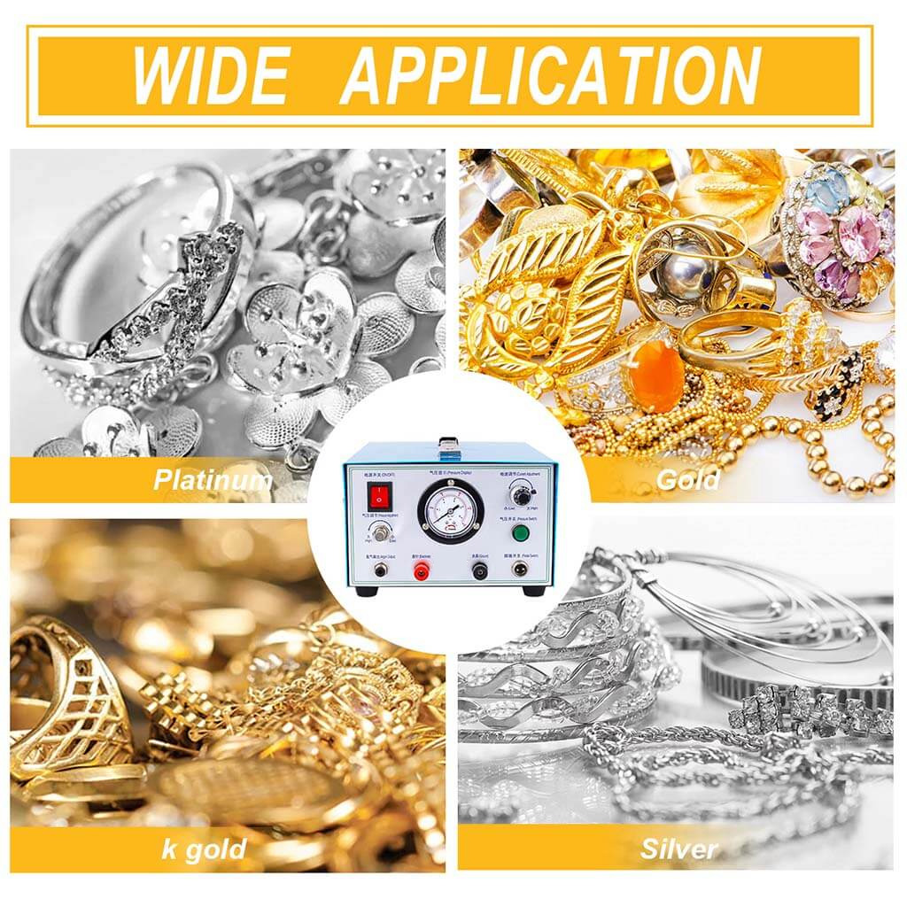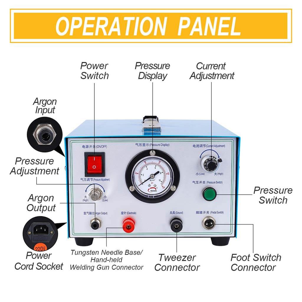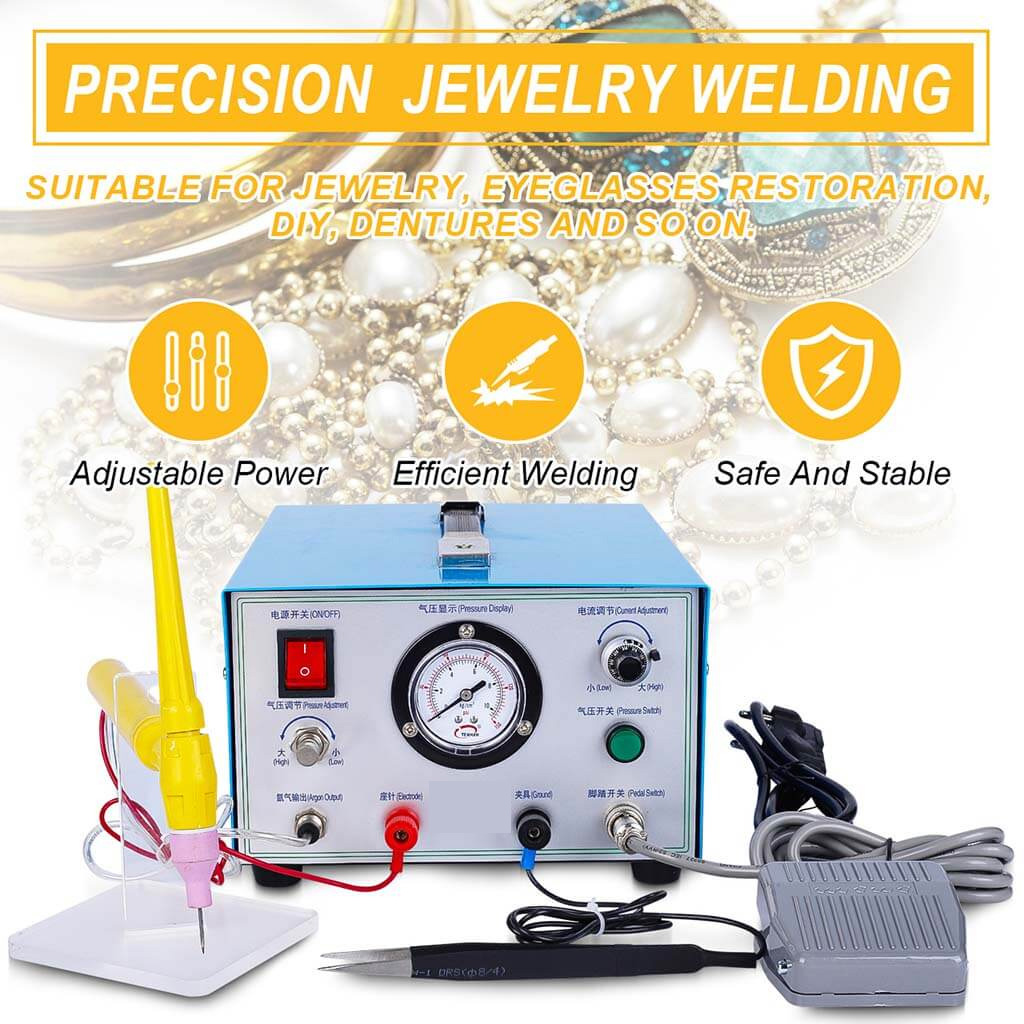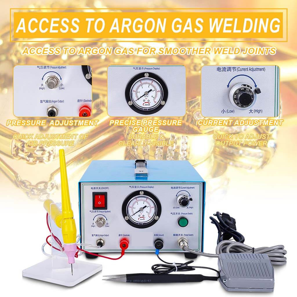 Jewelry spot welder using plasma high frequency discharge. Forms a molten pool at the metal welding joint. Includes coarse and fine adjustment knobs for output power. Visual barometer displays pressure. Argon protection connection available for oxidizable alloys. Thickened sheet metal shell with cooling holes.