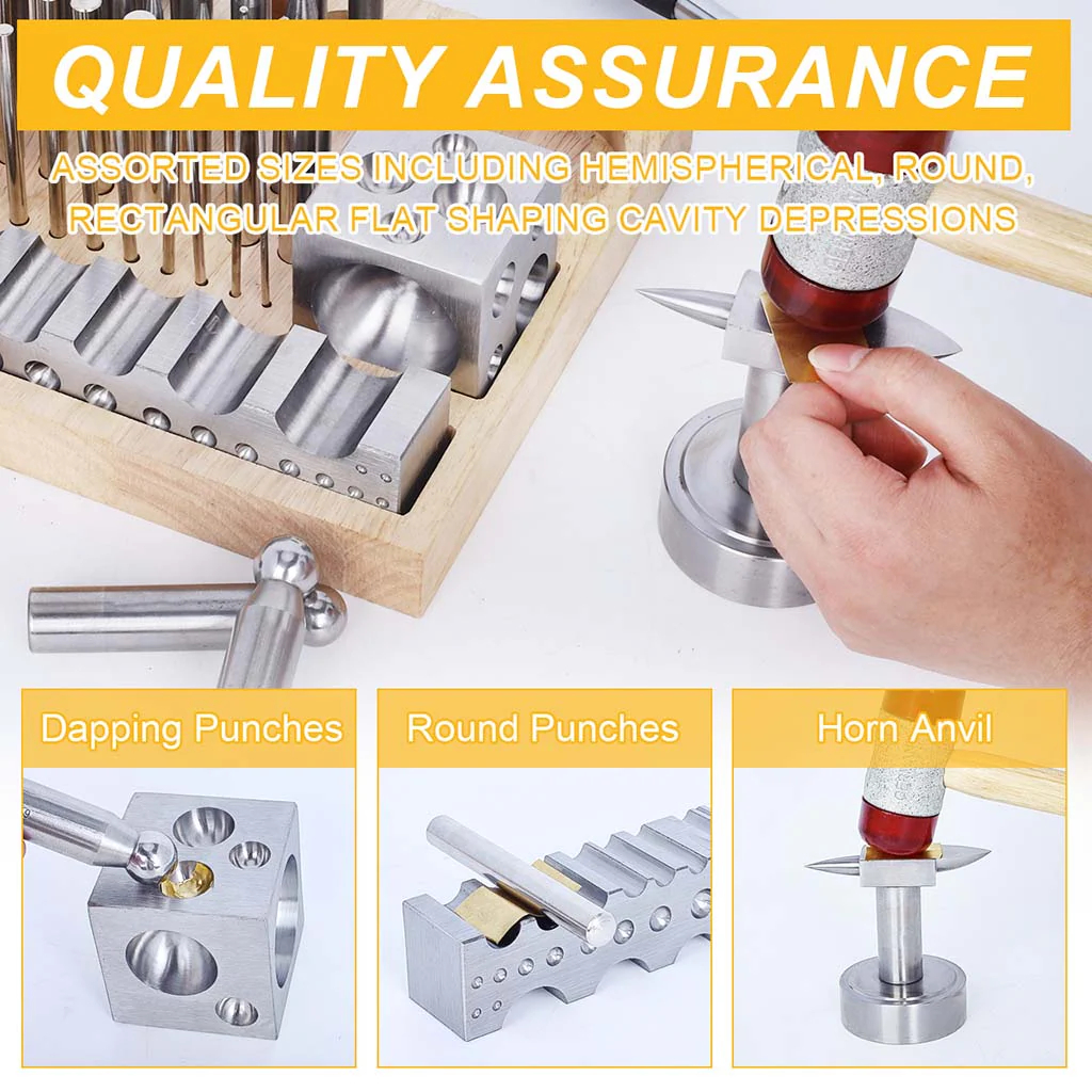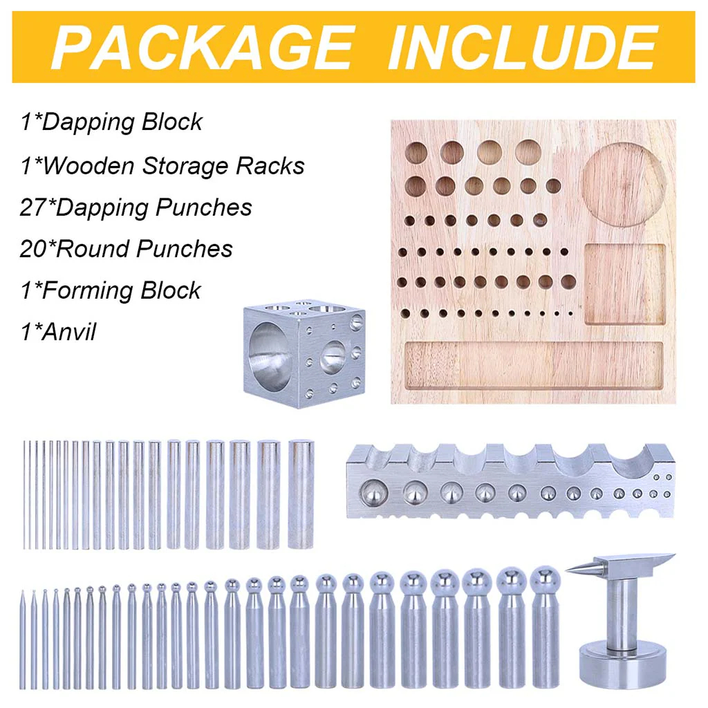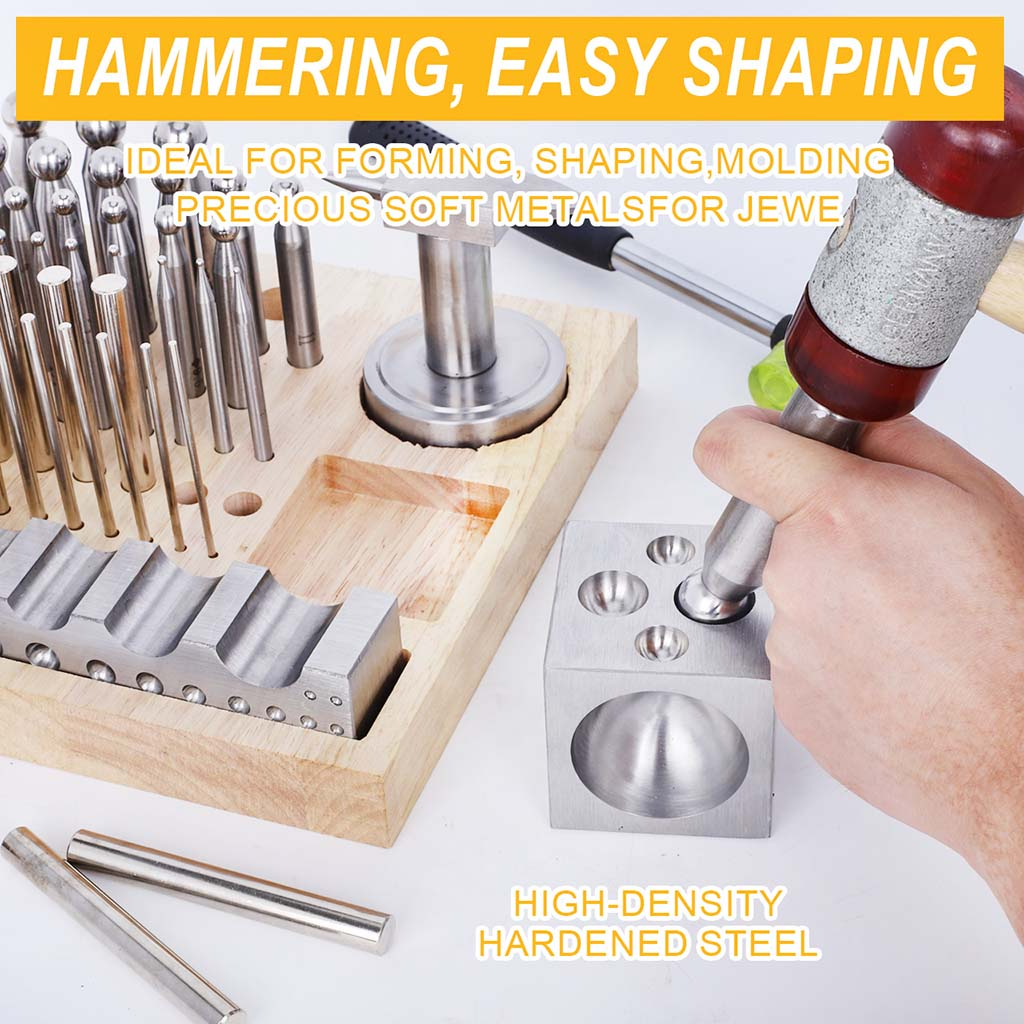 Dapping and forming tool set for metalwork. Includes punches, dapping block, forming block, anvil, and wooden storage rack. Used for shaping, doming, and chasing precious metals and soft metals.