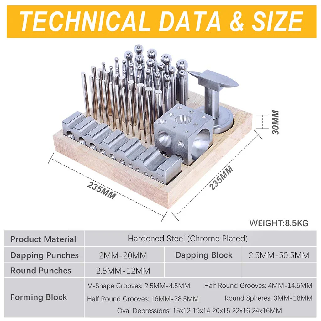 Dapping block: 65 × 65 × 65 mm, 21 depressions (2.5 mm to 50.5 mm)