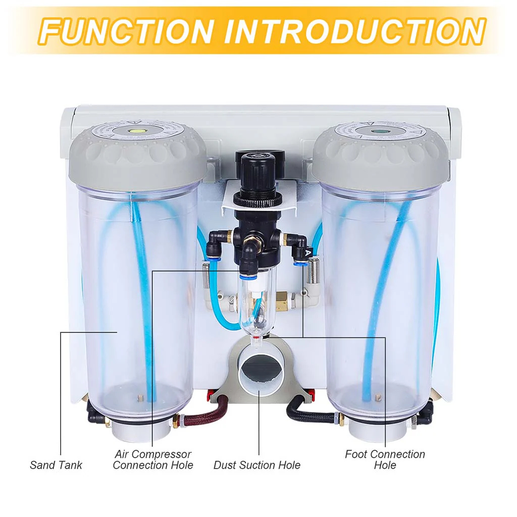 Dry sandblasting machine with wide-screen glass work plate and external glass plate seal. Two glove work holes. Pressure regulator for real-time pressure adjustment. Independent exhaust pipe.