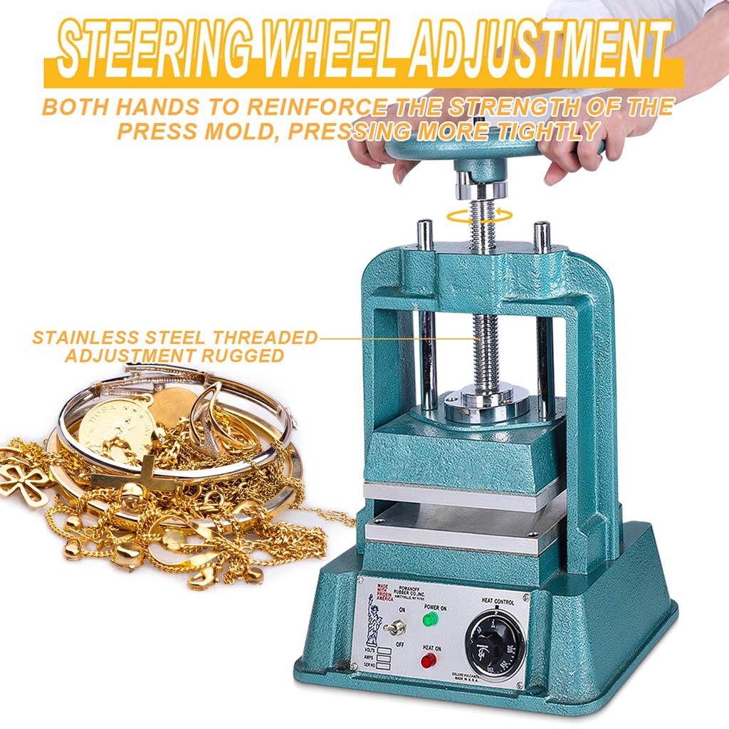Heating vulcanizer for jewelry casting molds. Applies heat and pressure to mold frames. Powder-coated cast aluminum construction. Straight shank design with cast aluminum U-rods. Thick aluminum plate. GE0 thermostat.