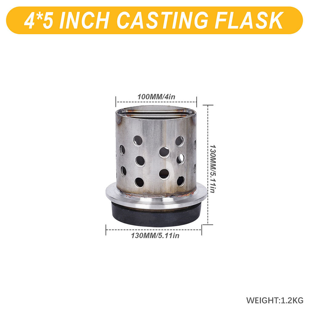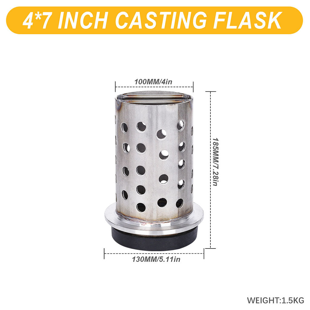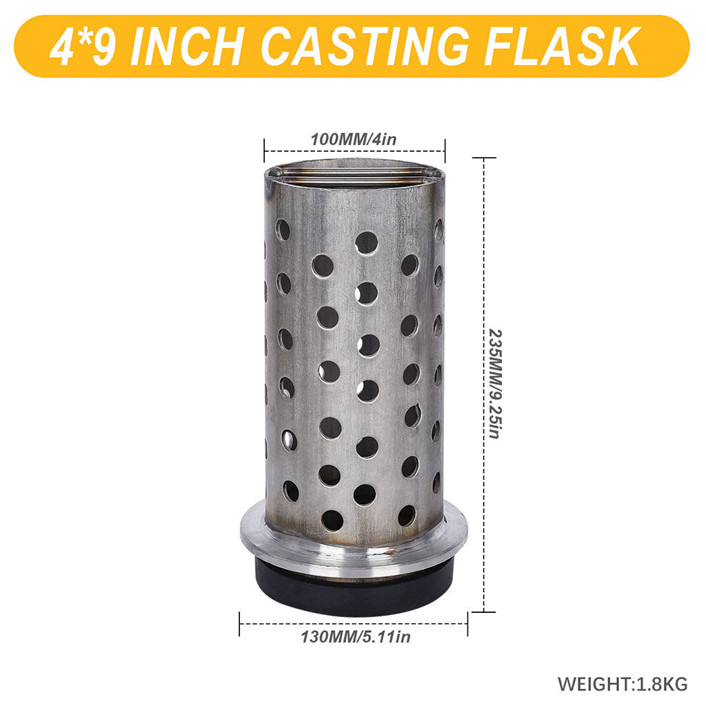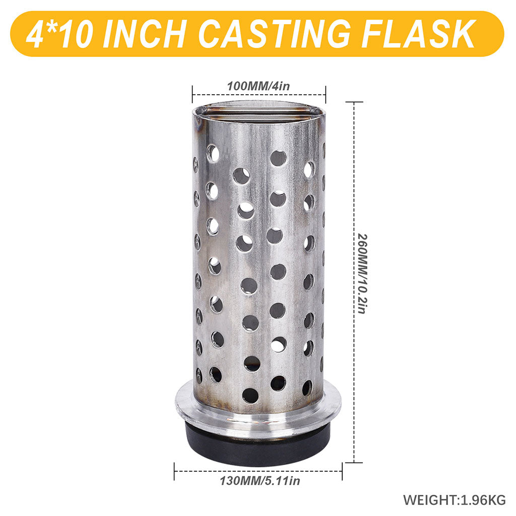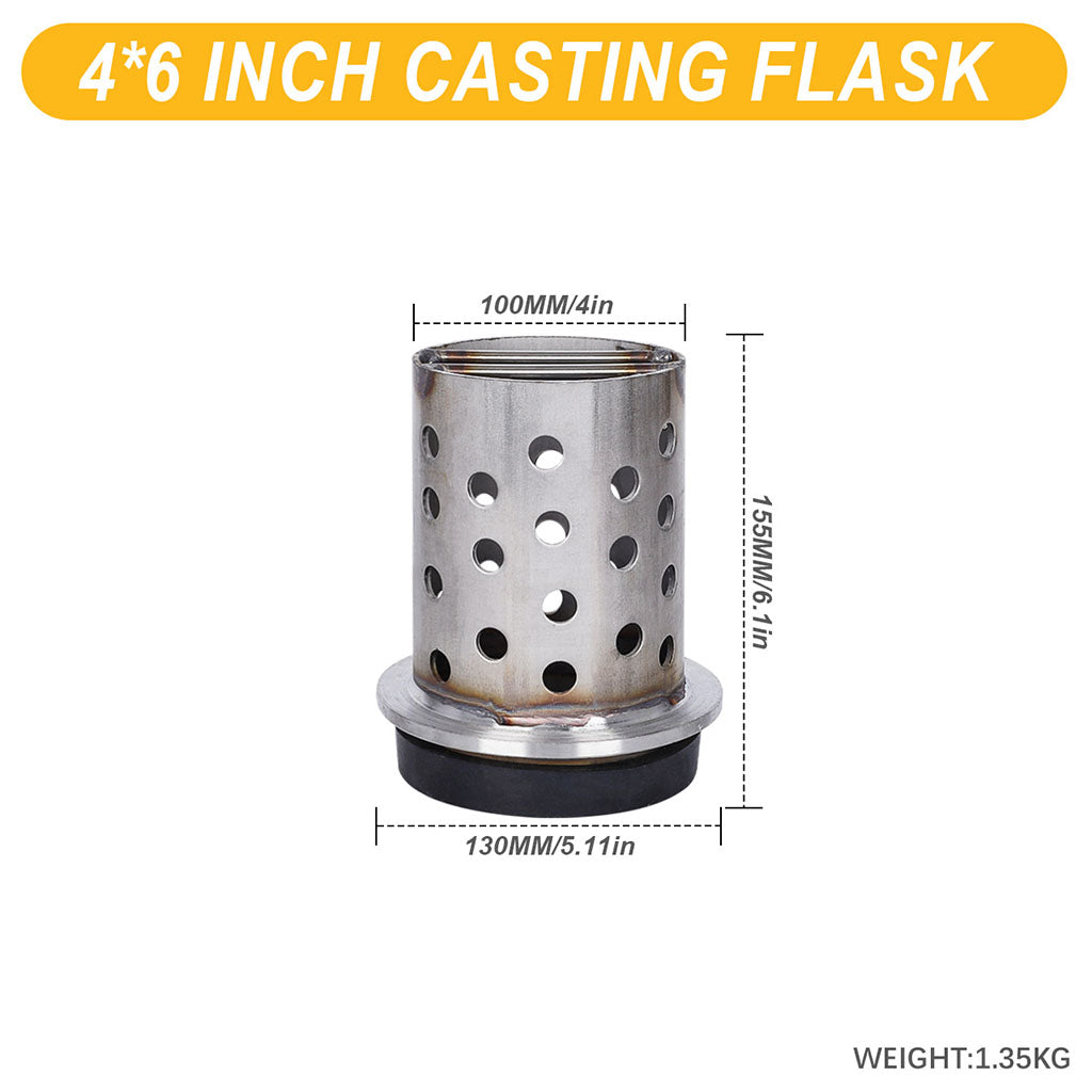 This 4" diameter casting flask is made of 304 stainless steel with a rubber base. The flask has a perforated body and a flanged end. Heat resistance up to 1150°C. Available heights: 5", 6", 7", 8", 9", and 10".