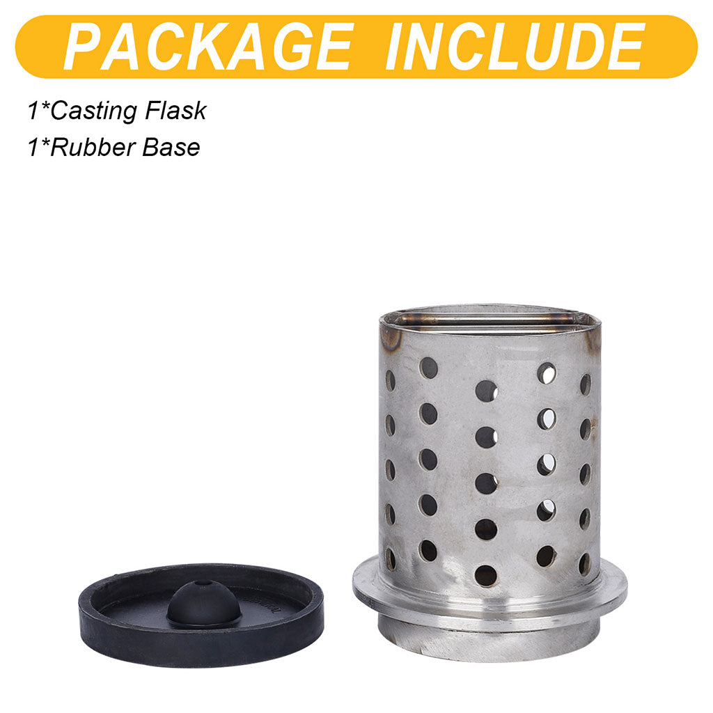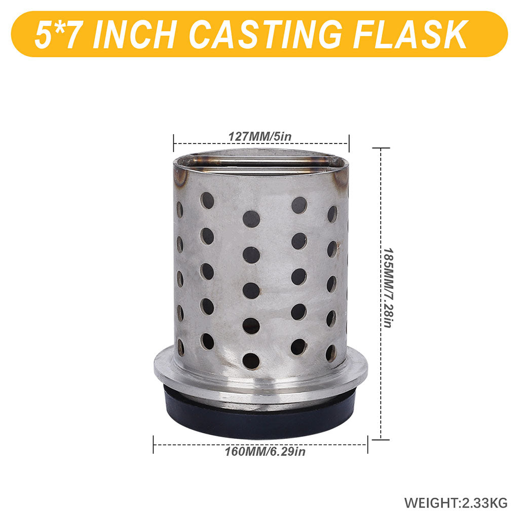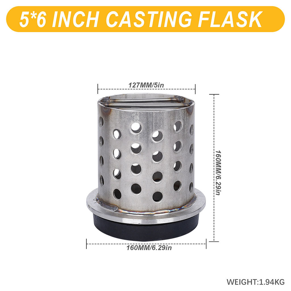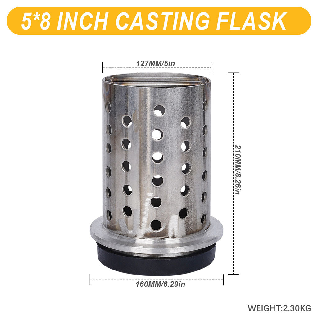 This 5" diameter casting flask is made of 304 stainless steel with a rubber base. The flask has a perforated body and a flanged end. Heat resistance up to 1150°C. Available heights: 6", 7", and 8".