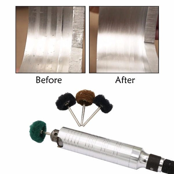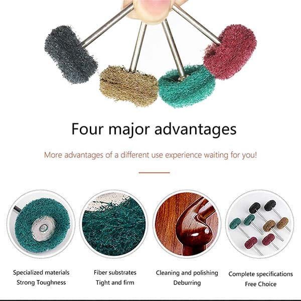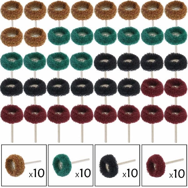 This set includes 40 abrasive buffing wheels with 3mm shanks. The wheels are made of scouring pad material. Used with electric rotary tools for grinding and polishing on materials including wood, metal, and stone.