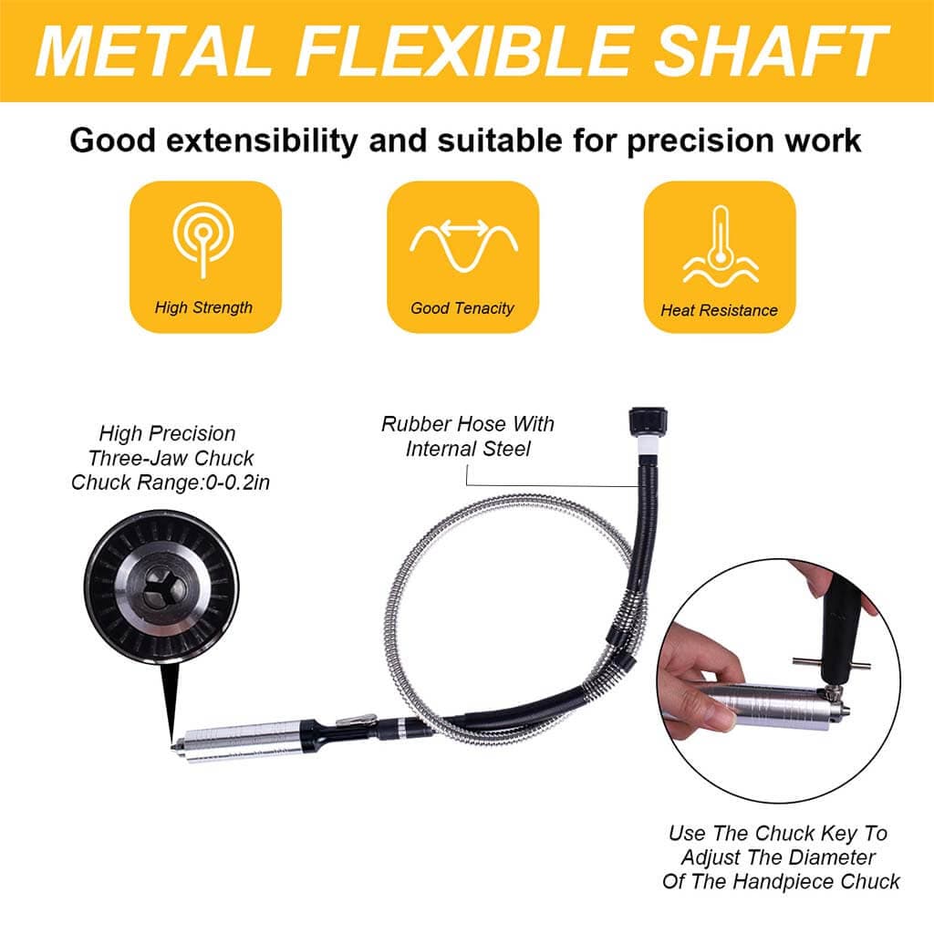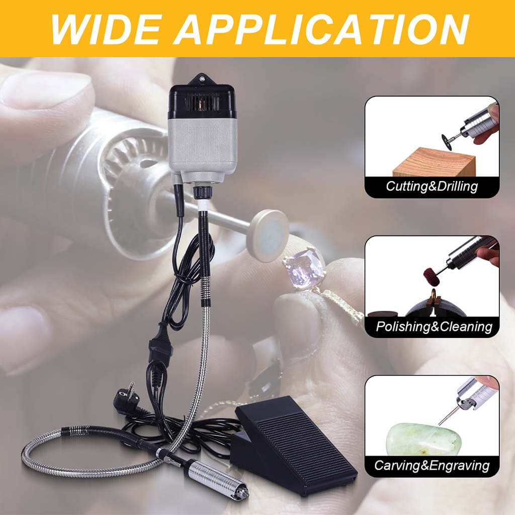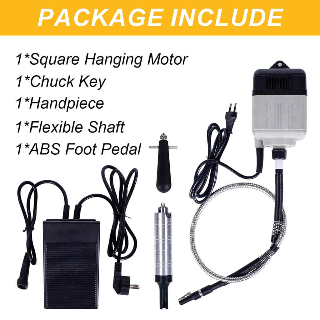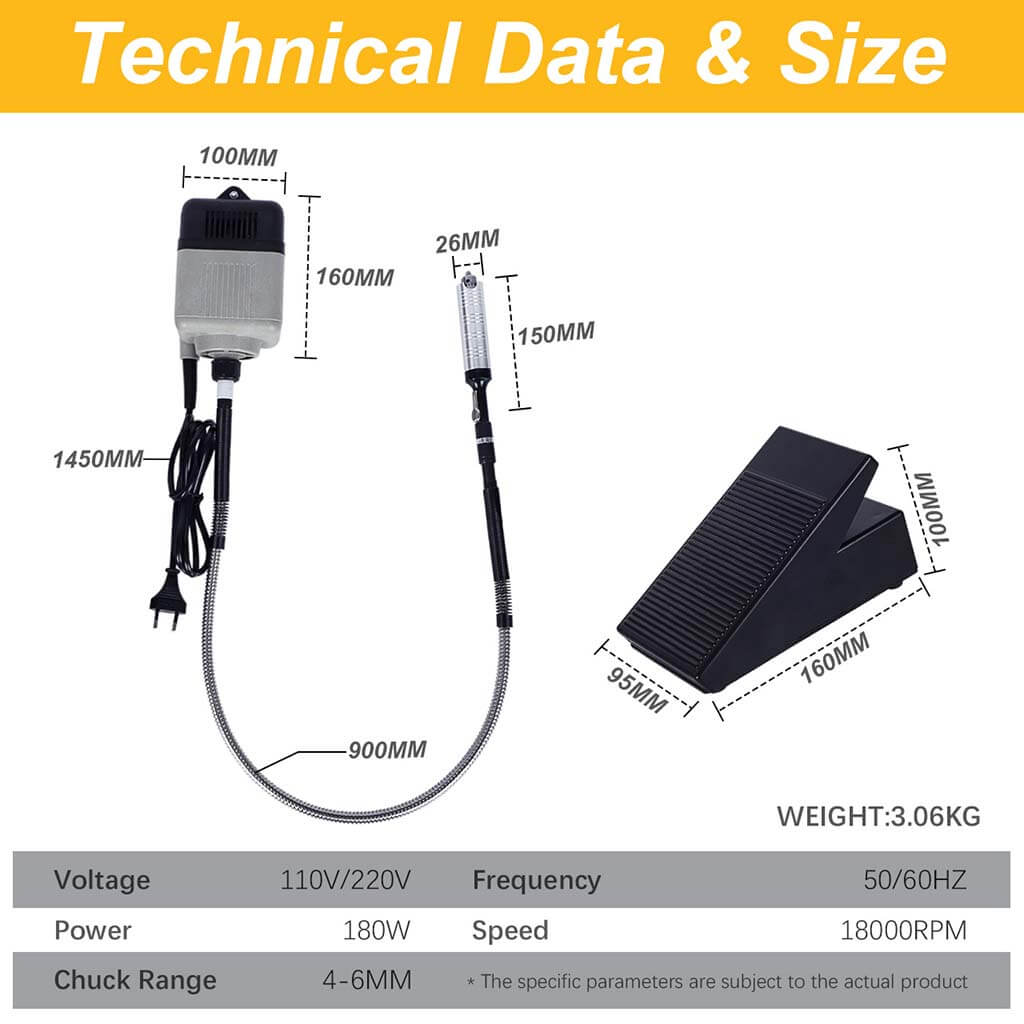 This flex shaft rotary tool includes a 180W motor, a flexible shaft, a handpiece, and an ABS foot pedal. The motor operates at 18,000 RPM. The flexible shaft length is 100cm with a rubber coating. The handpiece uses a three-jaw chuck. The foot pedal includes a screw for speed adjustment.