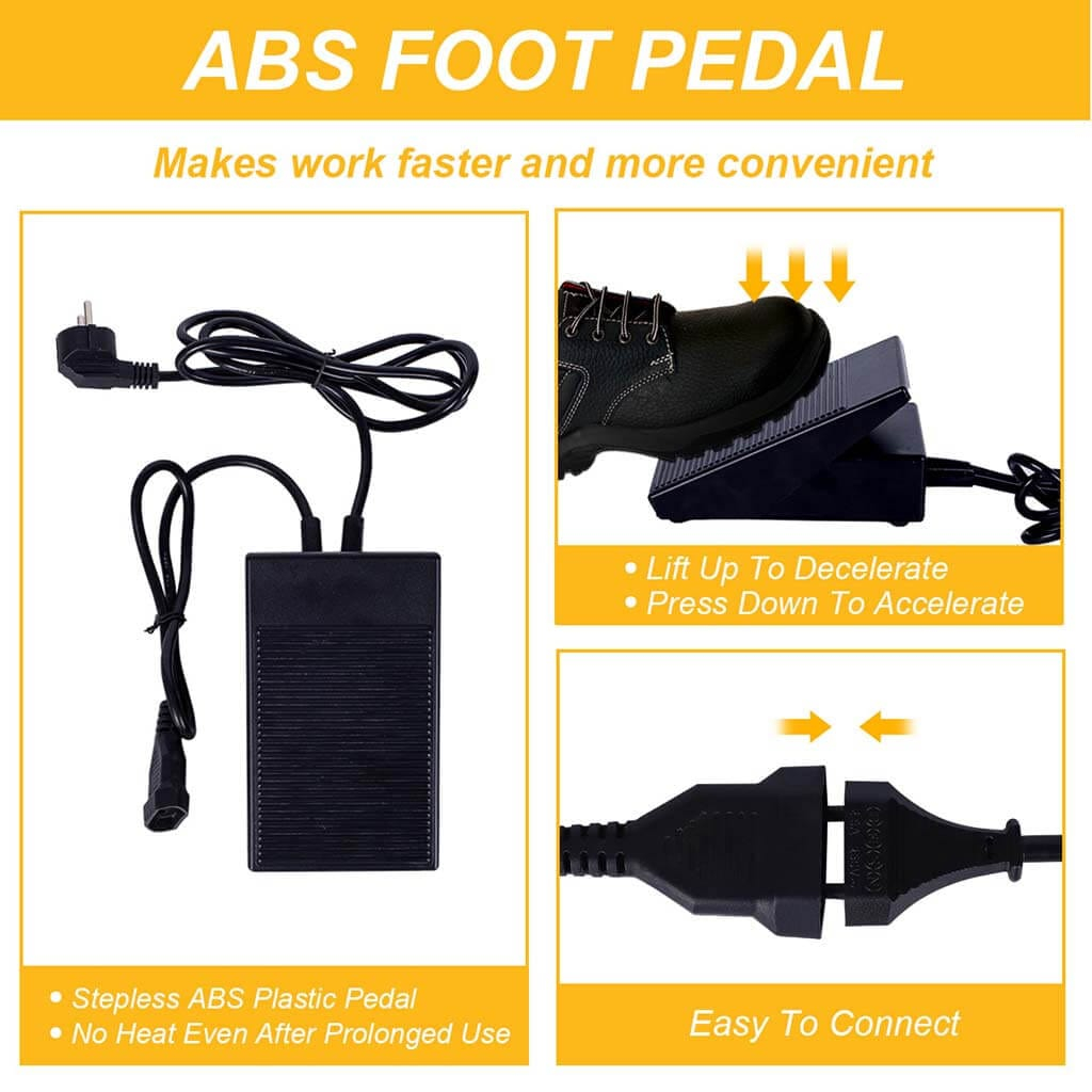 Foot pedal material: ABS plastic, includes speed adjustment screw.